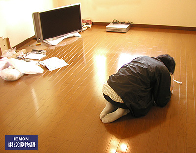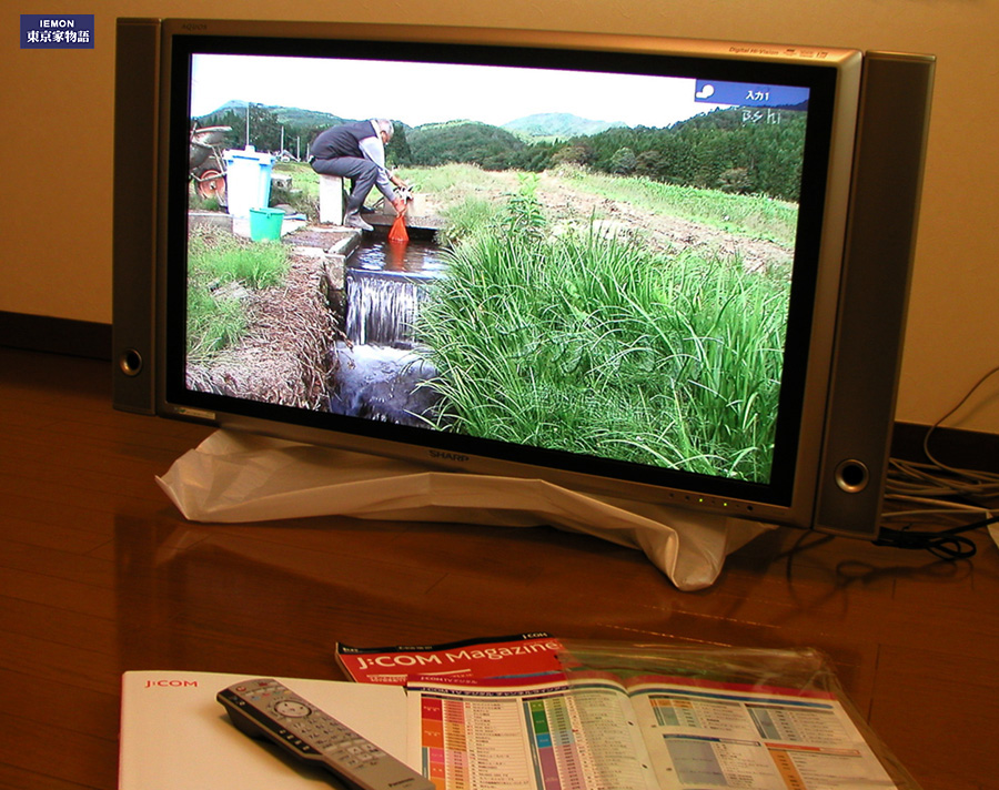 我が家は今まで14インチのブラウン管テレビ(音声はモノラル)でしたが、今回の住み替えを機会に「37インチ液晶のでっかいテレビ」に買い換えました。清水の舞台から2万回ぐらい飛び降りて、おもいきった出費です。J:COMから派遣されてきたおじちゃんがチューナーとデッキの配線をしながら試写しています。なるほど、フルスペックのハイビジョンではありませんがとても鮮明です。家右衛門家の歴史始まって以来の大きなテレビ。記念すべき進歩です。