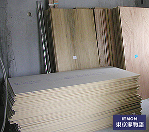 造作資材が搬入されています。木工事が本格化します。資材は場所をとるので段階的に数回に分けて持ち込まれるようです。石膏パネルの「タイガーボード」もあります、もちろん吉野石膏製です。プラスターボードは熱には強く遮音効果もありますが水には弱いので水気の多いキッチンにはキッチンボードなるものを別途用いるようです。じつに多様な材が山積みされています。大工の大和田獏いわく「ほんとにいろんな材を使うんですよ、パルコンは建物自体が特殊ですからねぇ....」。