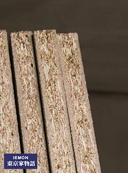 屋内には床材になると思われるパーチクルボードボード(これまたF☆☆☆☆)が大量に立て掛けてあります。そして水色の断熱材スタイロフォーム(スタイロエースII:ダウ化工の製品25mm厚)、白い発泡スチロールの断熱材、マルチパネル(黒く細長いフォームのパネルで床まわりに使う)が搬入されており、それらが施工されつつあります。