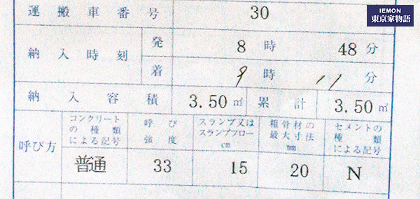 伝票を見ると呼び強度が33、スランプが15で指定してあることがわかります。今回は工場を出発してから現場に到着するまでの所要時間も短い! きっと家右衛門ホームページで仕事ぶりをアピールしてほしくて運転手(ミキサー親方)がドリフトさせながら猛スピードで飛ばしてきたものと思われます。