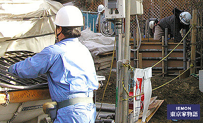 ポンプ車はブーム(腕)を延ばしてホースが敷地の奥まで届くか確認しています。規模が大きな建物ではこのタイプのポンプ車では届かないことがあるようです。打設中に「あれっ? 届かない」なんてことになると困りますね。我が家は狭くてよかった....? また、ポンプ車の構造で基本的には詰まることはないらしいのですが生コンの中にセメントの塊や異物が混入してホースで詰まることはあるといいます。詰まったら叩きながら調べて除去するらしいです(監理のM氏談)。