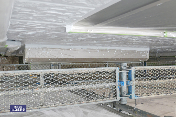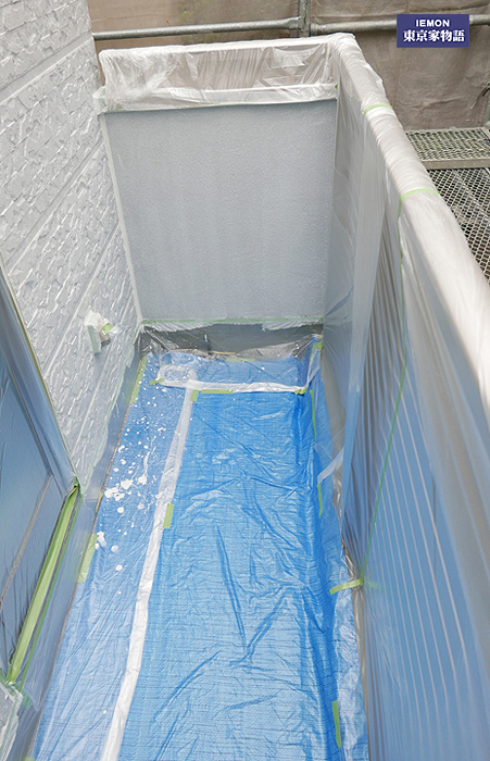 ちなみに陸屋根の外周やバルコニー、玄関庇(ひさし)など部分的にはそのあとの工程「防水工事」の範疇となるので、そこは塗装せずに残しておきます。