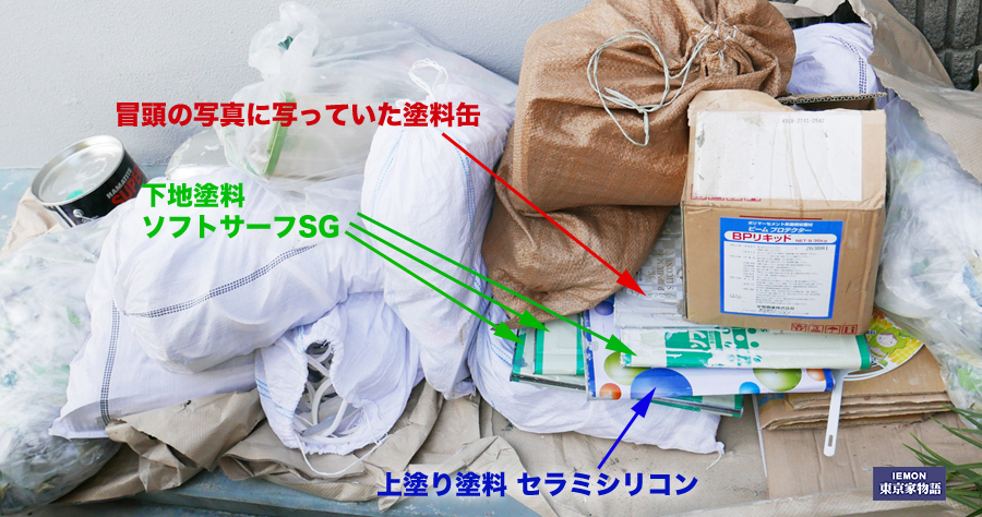 我が家の上塗りは前回紹介したとおり、水性セラミシリコンシリーズですから、これも問題の写真に写っているもので無いことはすぐにわかります(セラミシリコン塗料缶は青地で側面や裏面にまで水玉模様が印刷されている)。